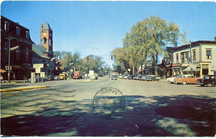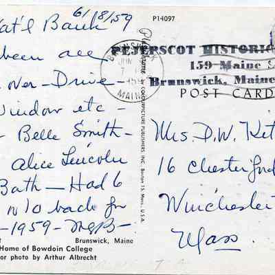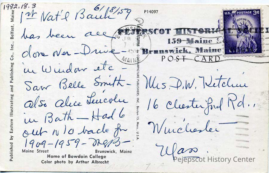 Colored postcard of Maine Street, Brunswick. Sent to Mrs. Donald (Evelyn) Kitchen, postmarked in Brunswick June 9, 1959. Comments on First National Bank, Belle Smith and Alice Lincoln on back.Lexicon