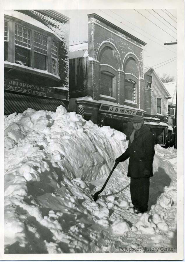 B/W photo of shoveling out on Maine Street after a snow storm. Pennell's Clothing and J. B. McDuff's stores in the background.