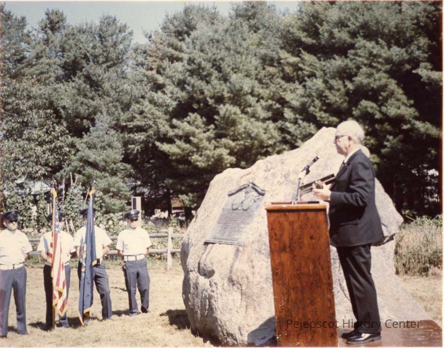 Photo of Major General Leigh Wade, last surviving pilot in the "Around the World Flyers" ,with a model of his airplane, speaking at the commemoration of the 50th anniversary of the landing near Mere Point, Brunswick, Maine, 1974.Lexicon
