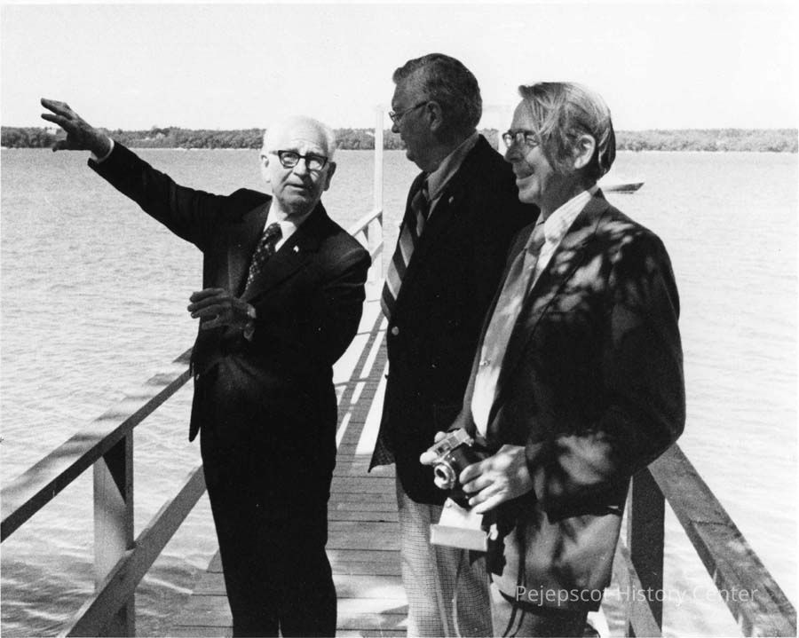 Photo of (left to right) Maj. Gen. Leigh Wade, Mr. Richard Leighton, Mr. Thomas Riley, on Riley's dock, at the commemoration of the 50th anniversary of the "Around the World Flyers", Mere Point, Brunswick, Maine, 1974.Lexicon