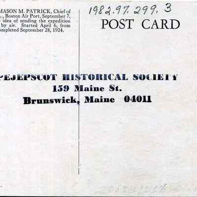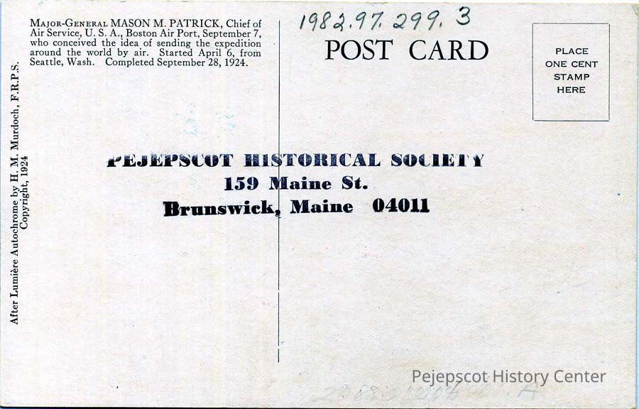 Color postcard of Major General Mason M. Patrick, Chief of U. S. Air Service, Boston Airport, September 7, who conceived the idea of sending the expedition around the world by air. Started April 6 from Seattle. Completed September 28, 1924.Lexicon