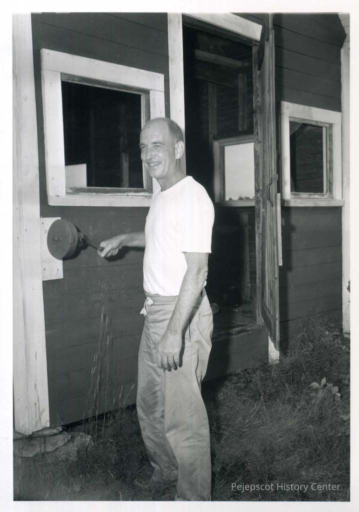 Malcolm Clarke, Fire Chief of Birch Island, stands by the Fire House and turns the siren handle on July 28, 1951.