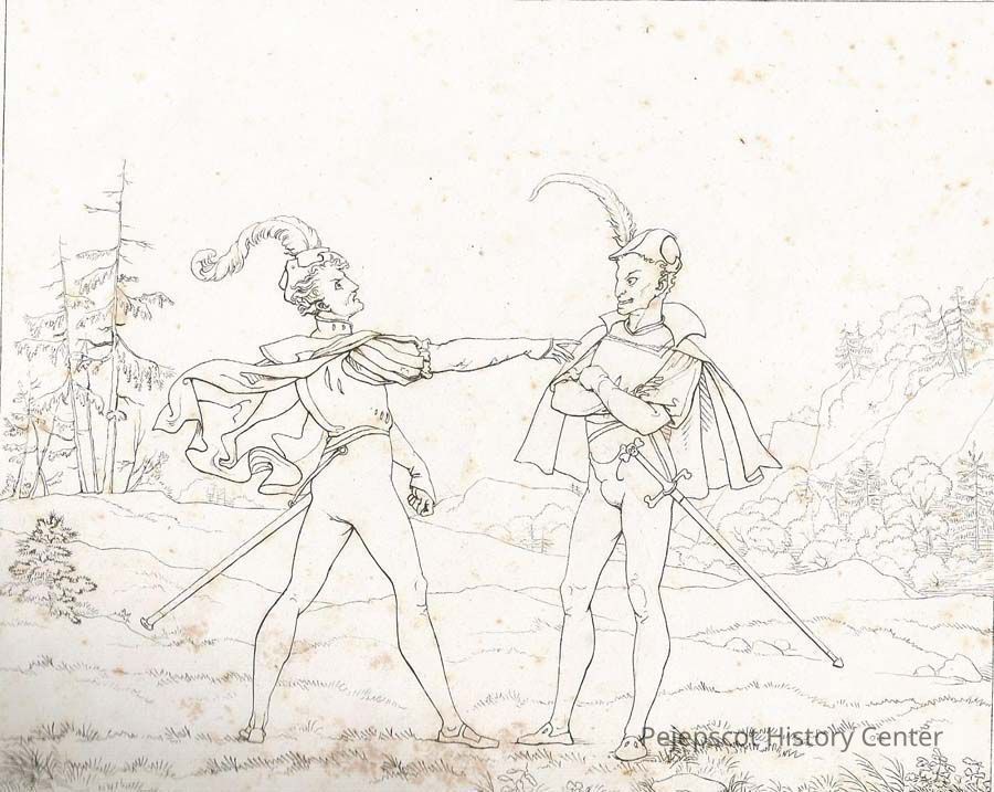 A B/W engraving of a man accosting another man who appears to be the devil. Illustration seems to depict a Renaissance-era story.