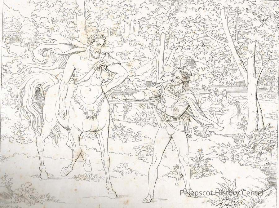 A B/W engraving of a man talking to a Centaur. A sphinx is seen in the background, as well as a group of bathing women. Illustration seems to depict a Renaissance-era story.