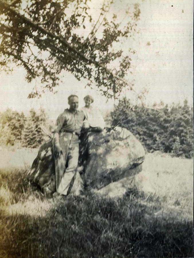 A B/W photo of a man standing next to a child sitting on a rock. Undated.