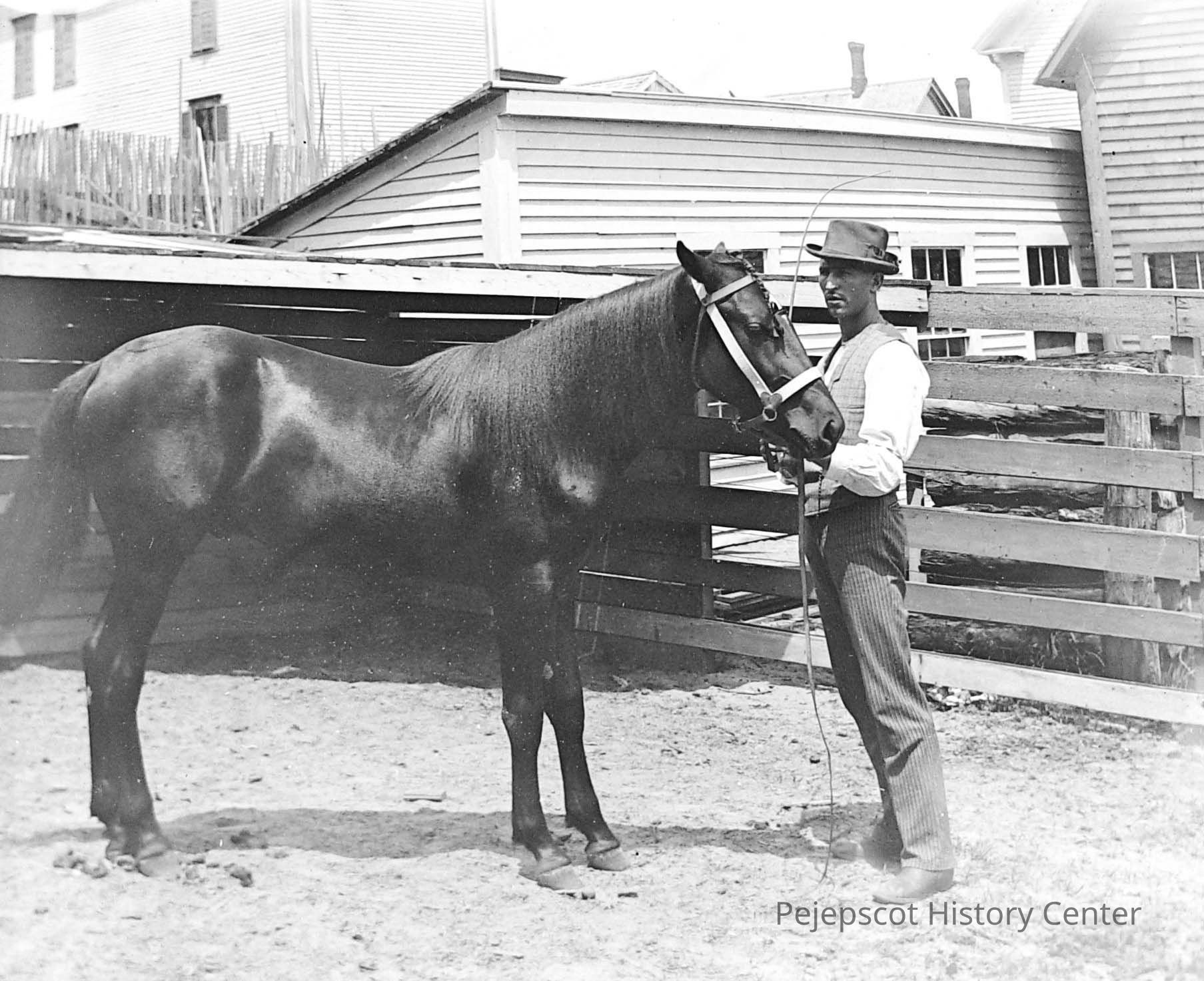 A glass plate negative with a photograph of a man holding a horse in the stables.