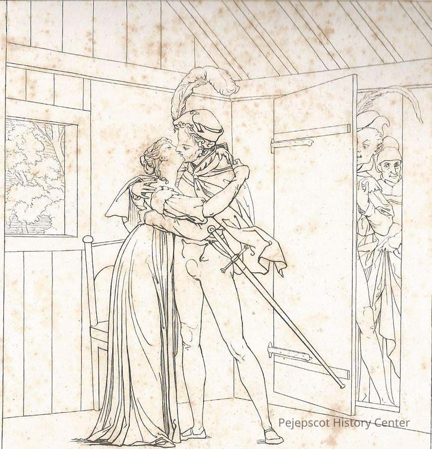 A B/W engraving of two people kissing while others peak through the door at them. Illustration seems to depict a Renaissance-era story.