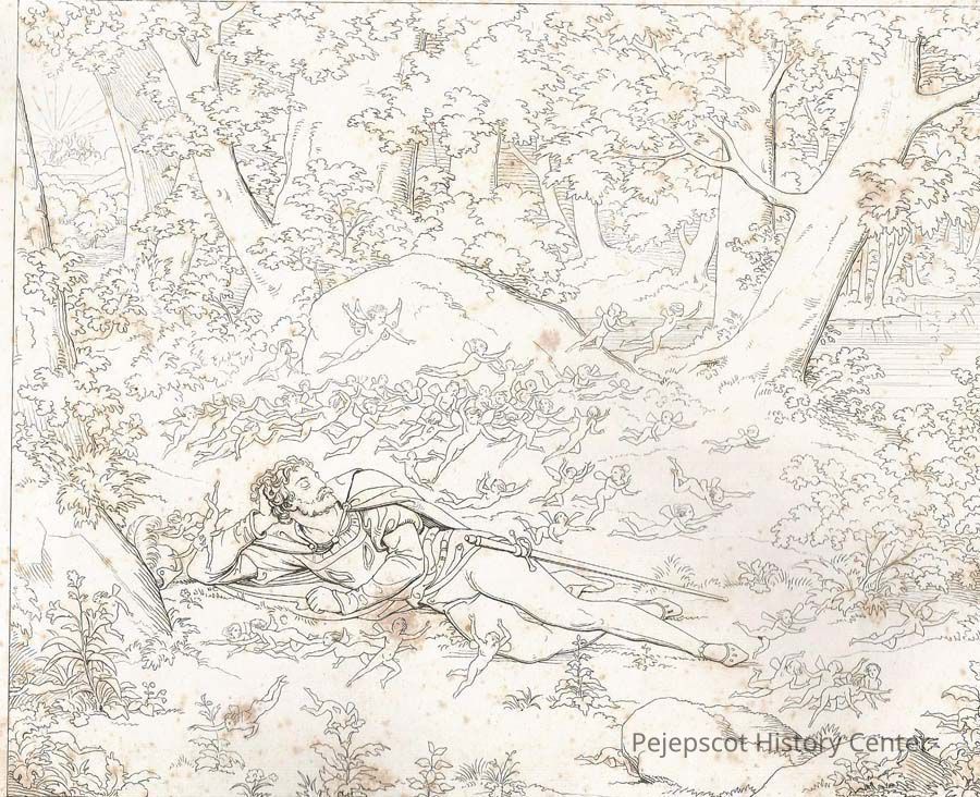 A B/W engraving of a man sleeping in the woods and dreaming of angels.