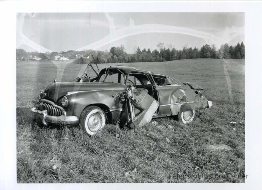 B/W photo of a car all smashed in after a fatal car accident in Bowdoinham, October 15, 1956. Charles Storer was killed.