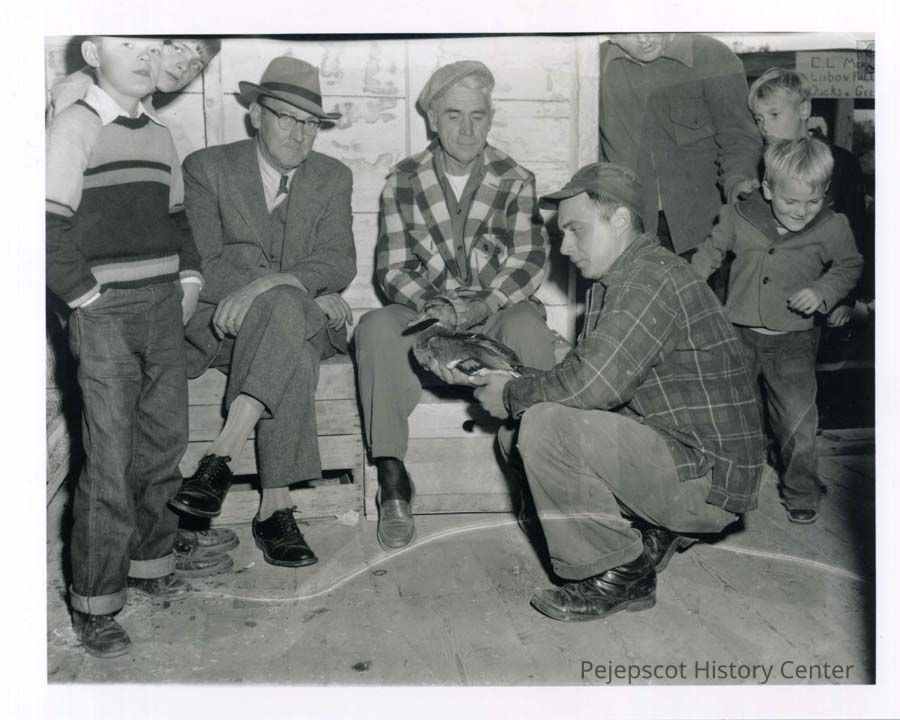 B/W photo taken at Topsham Fair of 2 men sitting on boxes and a man holding a duck in front of them. Two children are on each side of the photo.