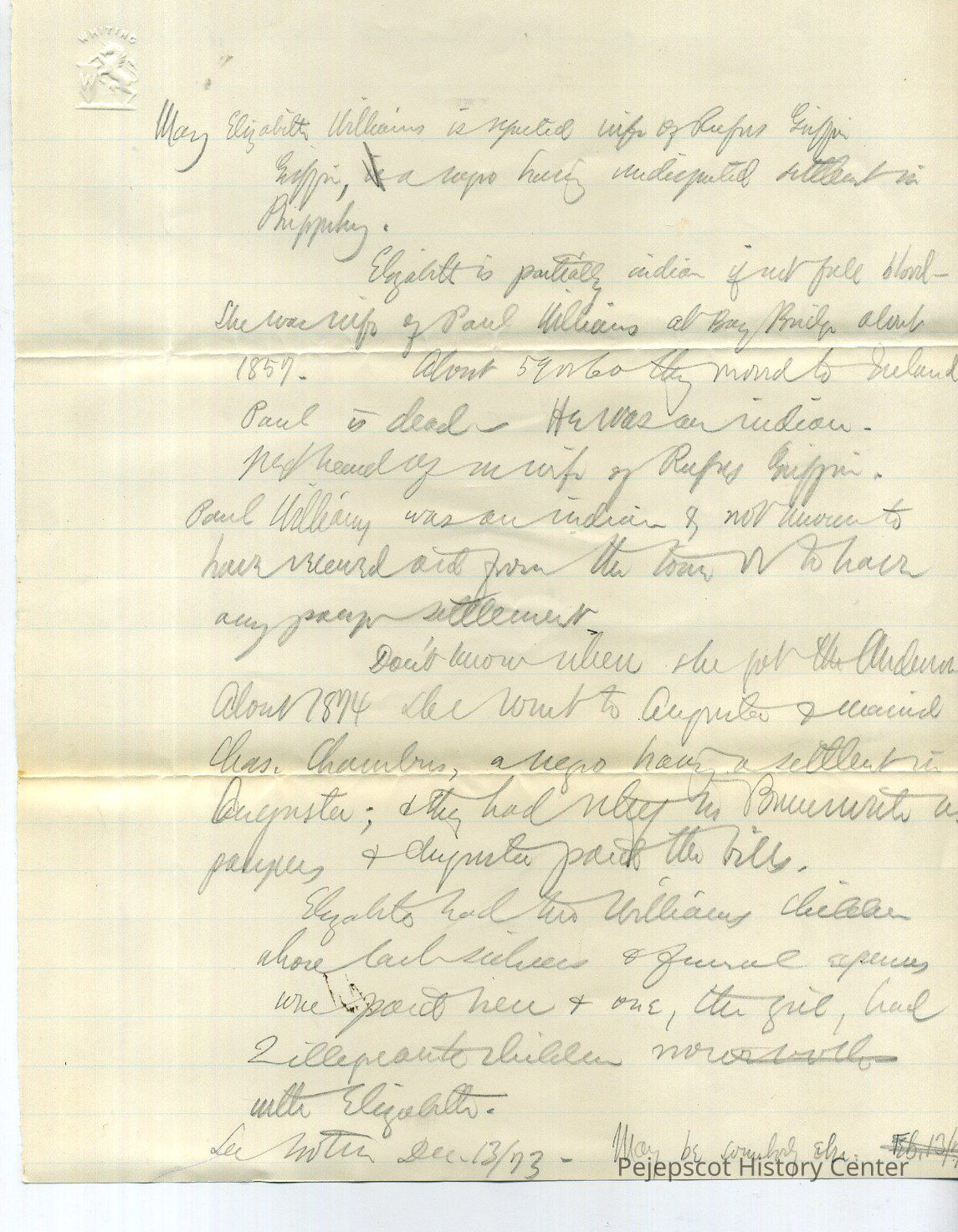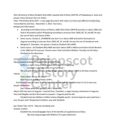 This document from 1873 contains information about Mary Elizabeth Williams, who was of mixed race, including Native American. She was married to Rufus Griffin, a Black man with an independent settlement in Phippsburg, Maine. At some point, Mary Elizabeth was also married to Native American Paul Williams and Charles Chambers, a Black man. It contains information about her financial situation, family, and other biographical information.