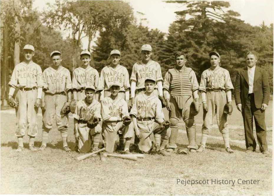 A B/W photograph of the Maple Leaf baseball team. Late 1930s early 1940s. Front row, left to right: Dominic Gamache (shortstop); Bertrand Dionne (right field); Phil Cote (left field) or Louis Gamache