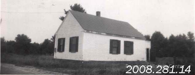 A B/W photo of the Maquoit School. It shows a wood frame building sitting by itself. No one is around the building. Marked on the back, "Maquoit." Undated.