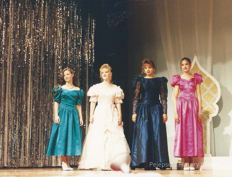 A color photograph of Mara Kane, Michele Byras, Courtney Garrison and Charity Edwards awaiting the announcement of the Miss Congeniality award.