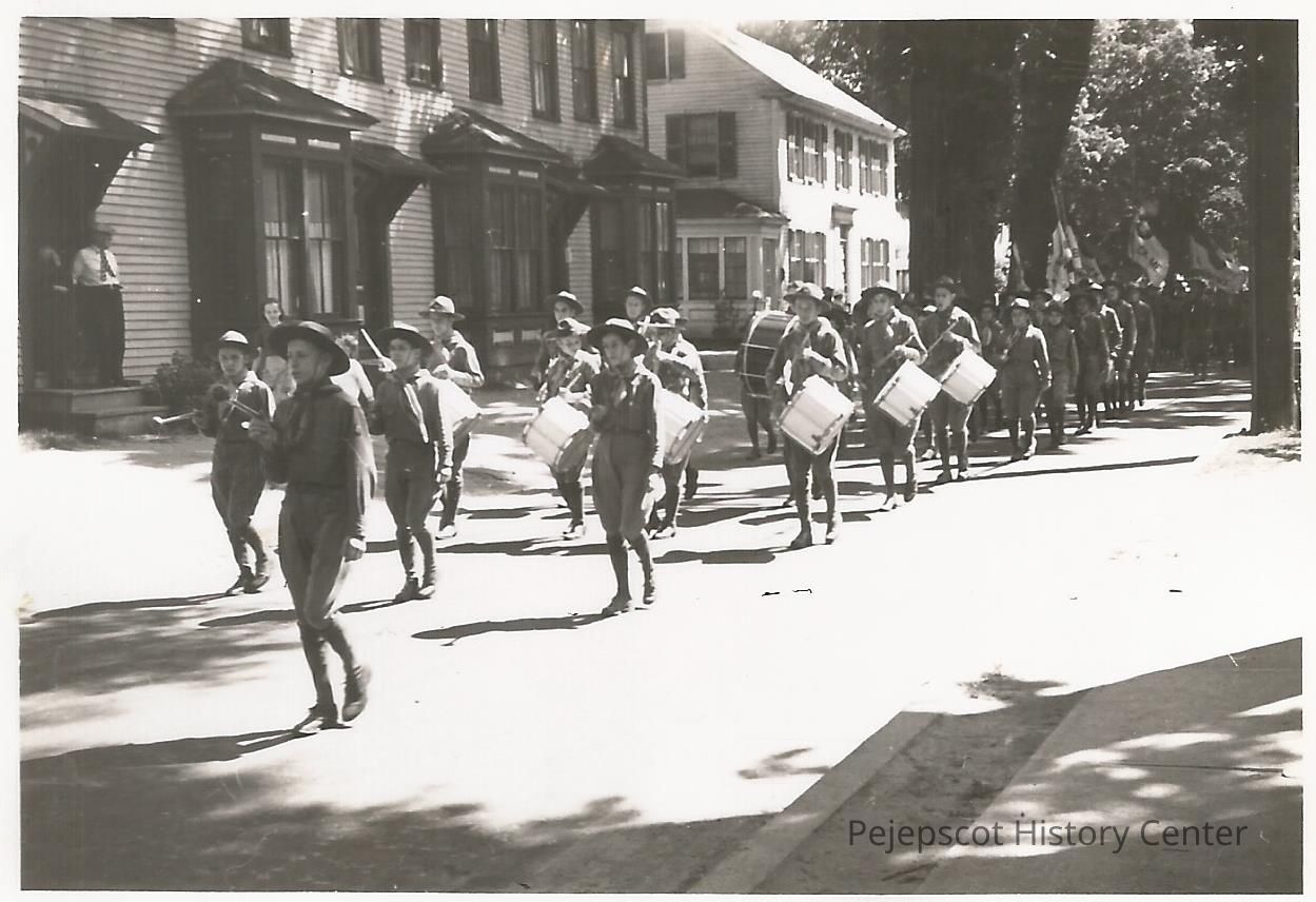 A B/W photo of a marching band in Brunswick's 200th Anniversary parade. Undated