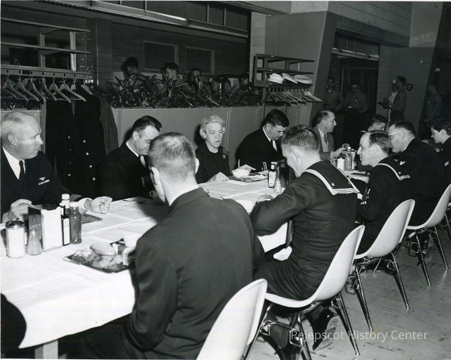 A B/W photograph of Senator Margaret Chase Smith eating with the troops at BNAS. Undated