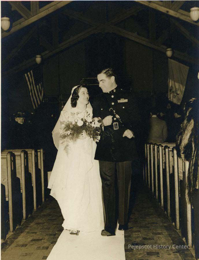 A black and white photograph of John R. Chaisson and Marguerite H. Martin walking down the aisle during their wedding at St. Charles Church at the corner of Maine & Noble Streets. Undated