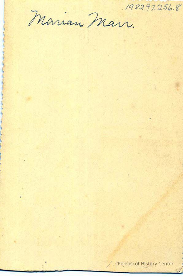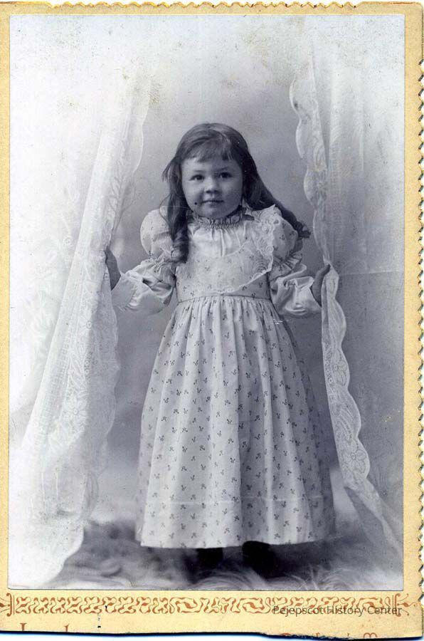 Black & white photograph of Marian Marr, a yound girl in long dress between curtains.