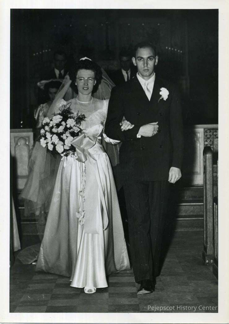 Therese Pauline Marin and Jacques Joseph Coulombe walking down the aisle at St. John's Church. 11/28/1946
