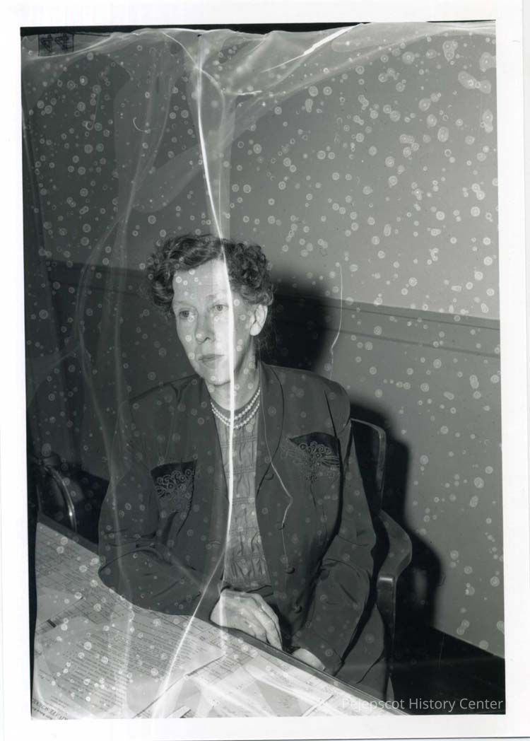 Marion McKenney (later Mrs. Emery Booker) sits at a desk. She taught the business course for many years at BHS.