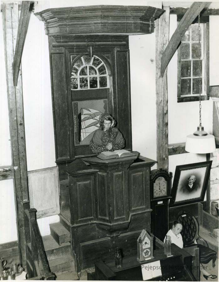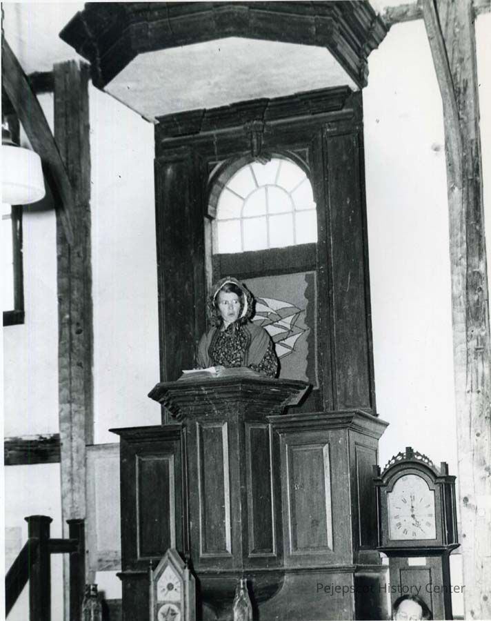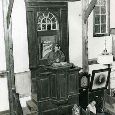 Two B/W photographic views of Marion Stover Thomas in the pulpit at the Old Meeting House, Harpswell. Undated