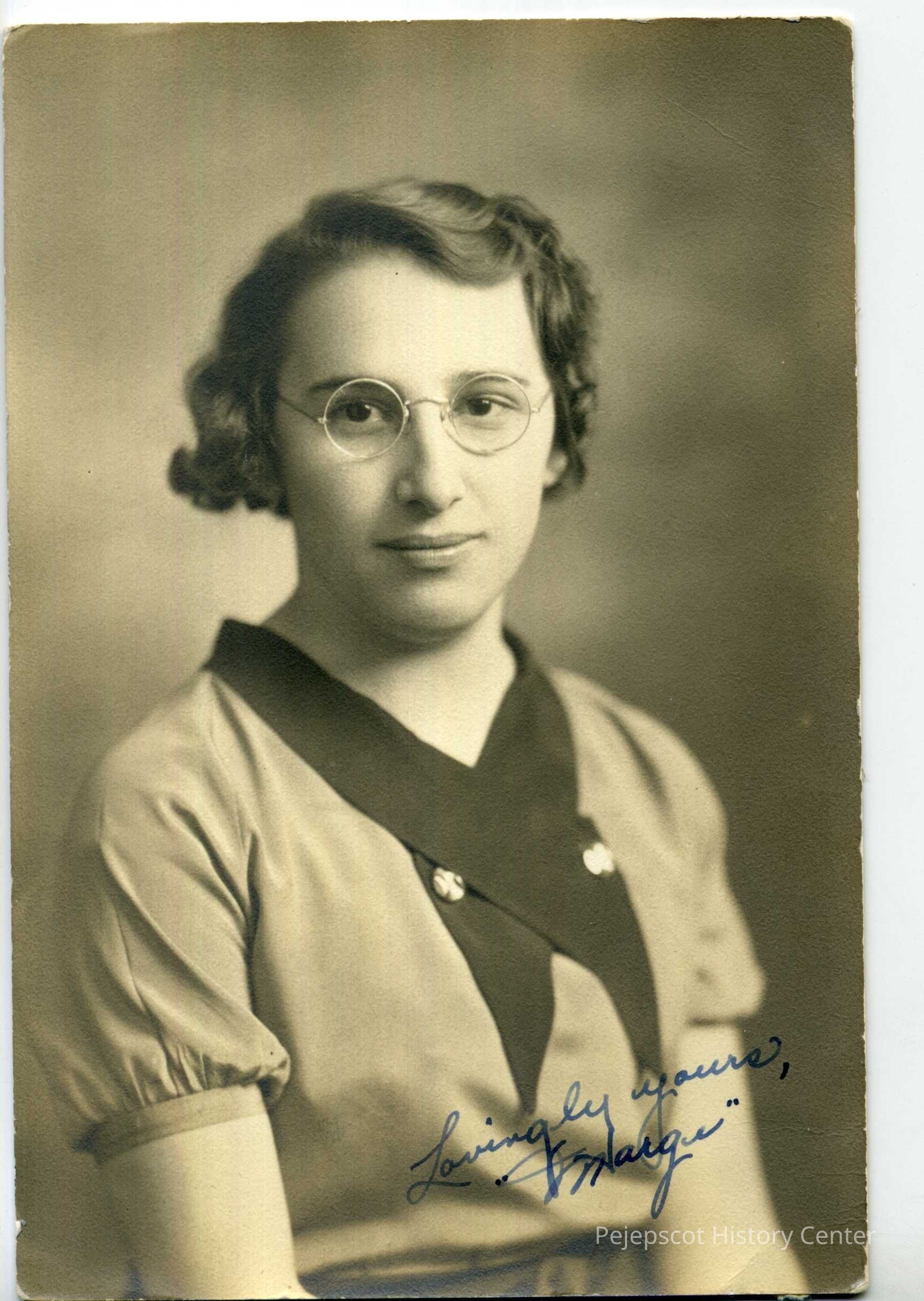 A black and white photograph of a woman identified as Marjorie Courson (Ricker), BHS Class of 1935. On the photograph are the words 'Lovingly yours, "Margi." '