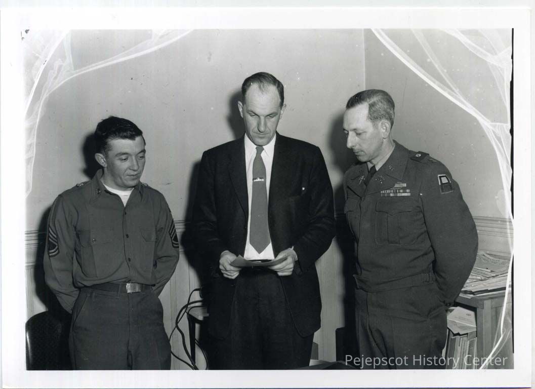 Town manager Merle F. Goff flanked by Capt. Winthrop Stowell, Battery C 703rd AAA Battalion and one unidentified sargent on Febrary 3, 1954.