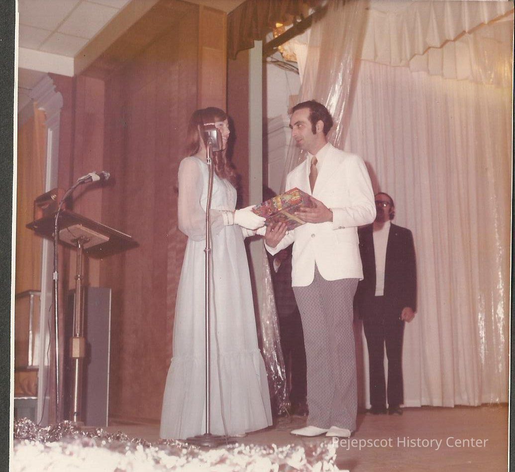Mary Ann Lincameli giving Gene Gagne a gift from the contestant