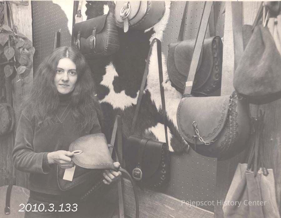 A B/W photograph of Mary Clement who along with her husband Albert owns the Old Oak Tannage Company which has a store on Maine Street. Photo published 12/10/1975. Undated
