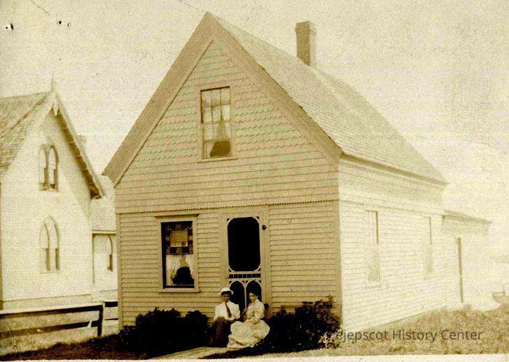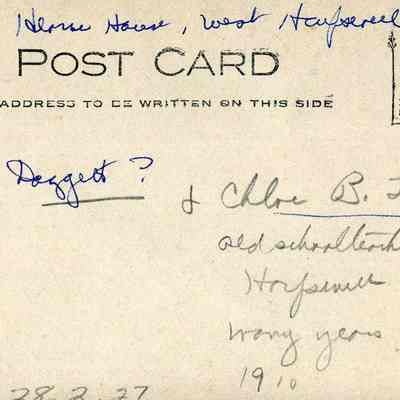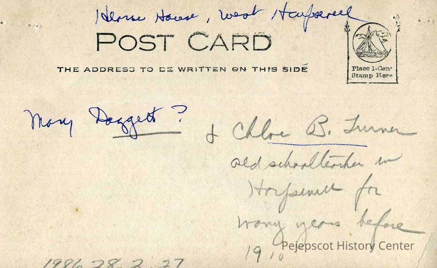 A B/W photographic view of a house with two women sitting in front. Marked on the back, "Hlorse House, West Harpswell" "Mary Dagget" "Chloe B. Turner an old schoolteacher in Harpswell for many years".