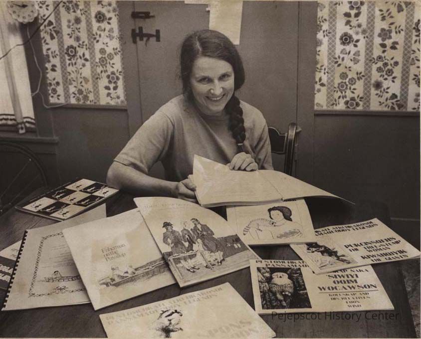 A B/W photograph of Mary Griffith with her collection about Indigenous people. The photo was published in the Times Record 8/17/1979.