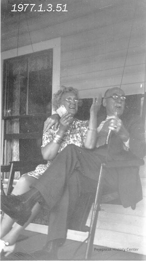 A B/W photograph of Mary Lilly and Al Brehaut sitting on a porch. Undated