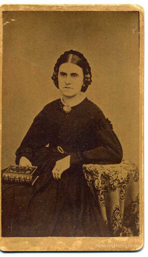 Black & white mounted photograph of Mary Marston Woodside, reading on back: "Wife of John A. Marston, Grandmother of Alice Toothaker, c. 1865." Showa a woman seated , elbow resting on cloth-covered table, with closed book in lap.Lexicon