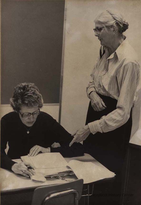 A black and white photo of Mary Obery, left, of Topsham and Nancy St. John of Phippsburg and Bath, was published in The Times Record in Brunswick, Maine, on 10/19/1977, accompanying and article about a hearing at Morse High School in Bath about juvenile crime.