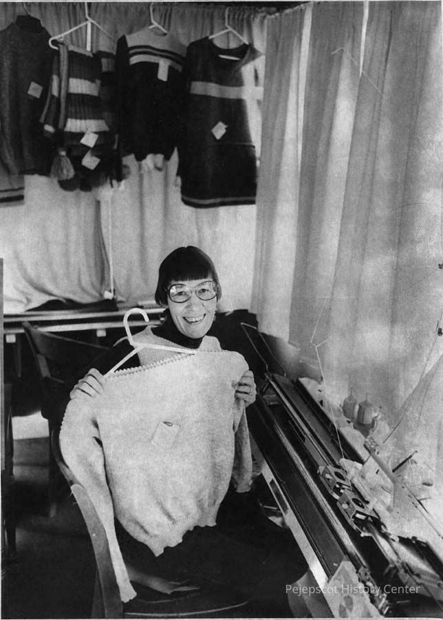 A black and white photo of Mary Settle of Topsham, showing one of her many knitted creations. This photo appeared in The Times Record in Brunswick, Maine, on 11/8/1980.