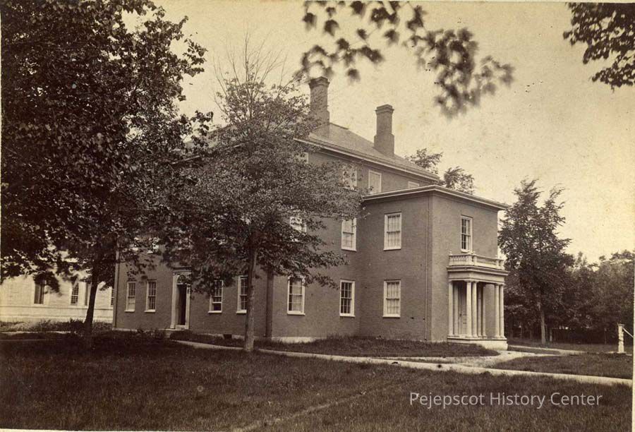 An undated black and white photo of the exterior of Massachusetts Hall on Bowdoin College campus in Brunswick, Maine.