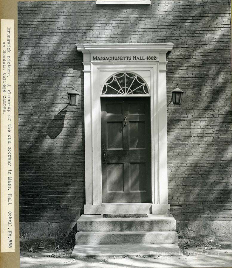 A black and white close-up photo of the doorway to Massachusetts Hall at Bowdoin College in Brunswick. The caption on the picture calls it "a close-up of the old doorway in Mass. Hall." The doorway has Massachusetts Hall and the date 1802 written at the top of it and three steps leading up to it. Undated