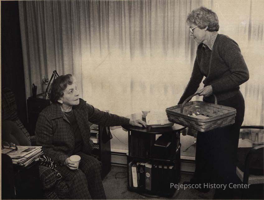 A black and white photo of Kitty Fenwick, a Meals on Wheels volunteer, delivering a meal to Matilde Marchant who was confined to her home with a heart ailment.