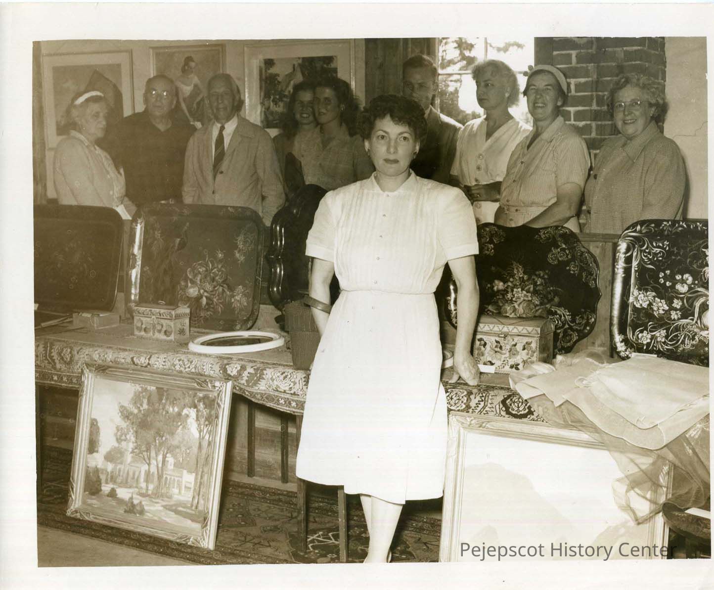 Mathilde Nixon Marchant standing in front of table with the trays she painted. Undated