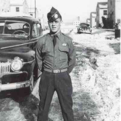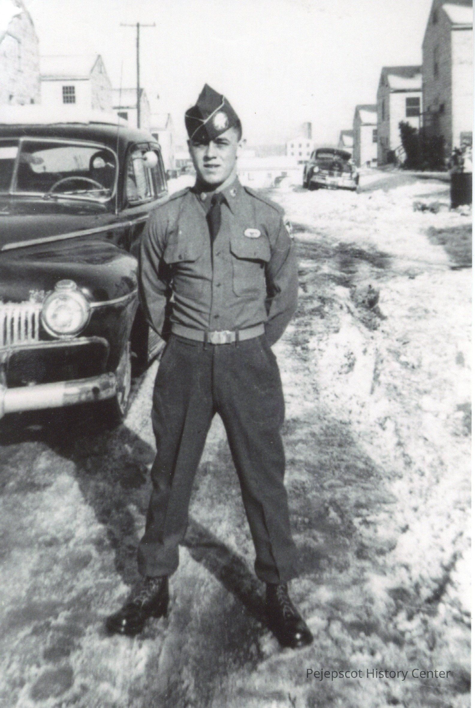 Black and white photograph of Maurice Paradis, standing in front of car, wearing military uniform.Collection