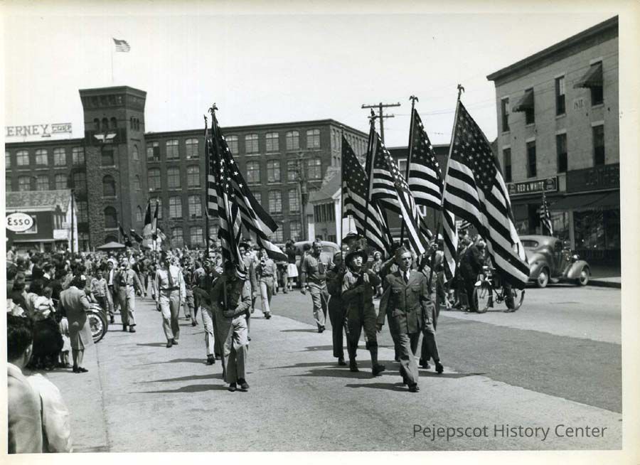 B/W photo of Memorial Day parade on Maine street. Probably early 1940s. Charlie Lowery leading.