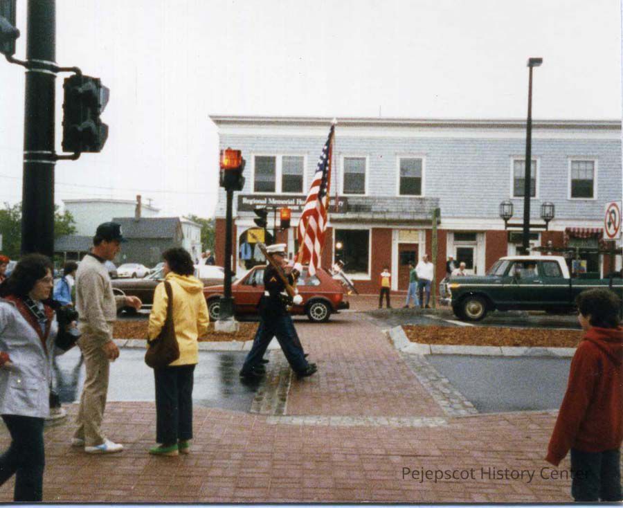 Maine Street, Brunswick, Maine Street, Memorial Day, Parades, Parades - Brunswick, Regional Memorial Hospital Auxiliary, Memorial Day Parade 1985, Secondhand Rose, Marine Corps, Color Guard