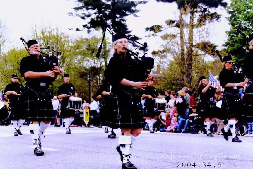A colored photograph of some Bag Pipers in the 2003 Memorial Day Parade in Brunswick.