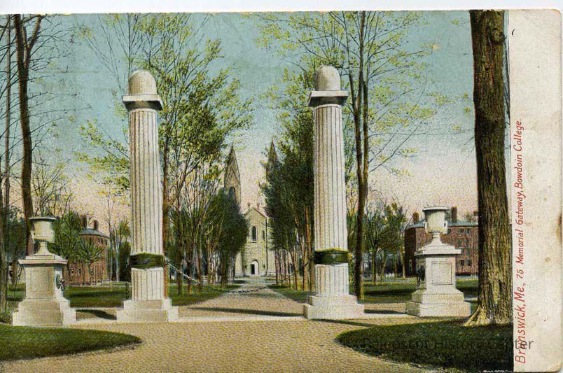 An undated color postcard of Memorial Gateway, Bowdoin College. The Bowdoin Chapel in the distance. The site immediately behind the Memorial Gateway is currently the Visual Arts Center.Lexicon