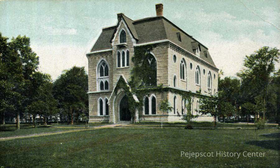 A color picture postcard view of Memorial Hall, Bowdoin College, Brunswick, ME. Undated.