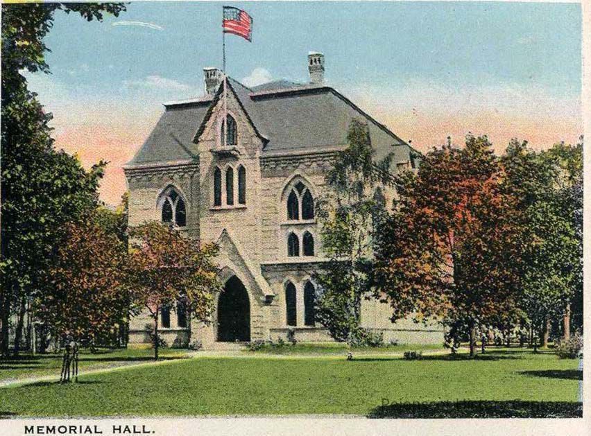A color picture postcard view of Memorial Hall, Bowdoin College,