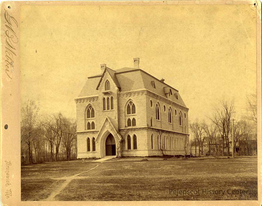 Sepia mounted photograph of Memorial Hall, Bowdoin College, Brunswick.