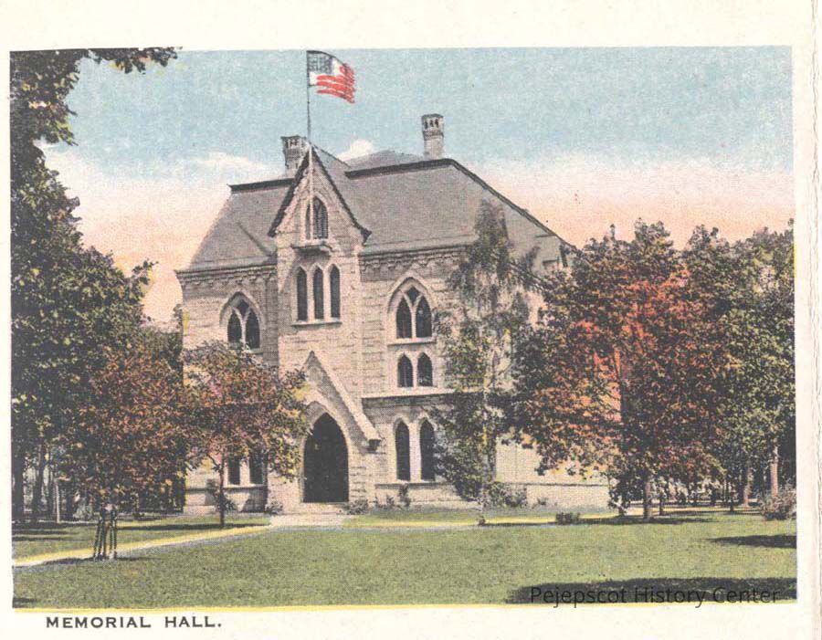 Postcard view of Memorial Hall, Bowdoin College, Brunswick, Maine. Date unknown.