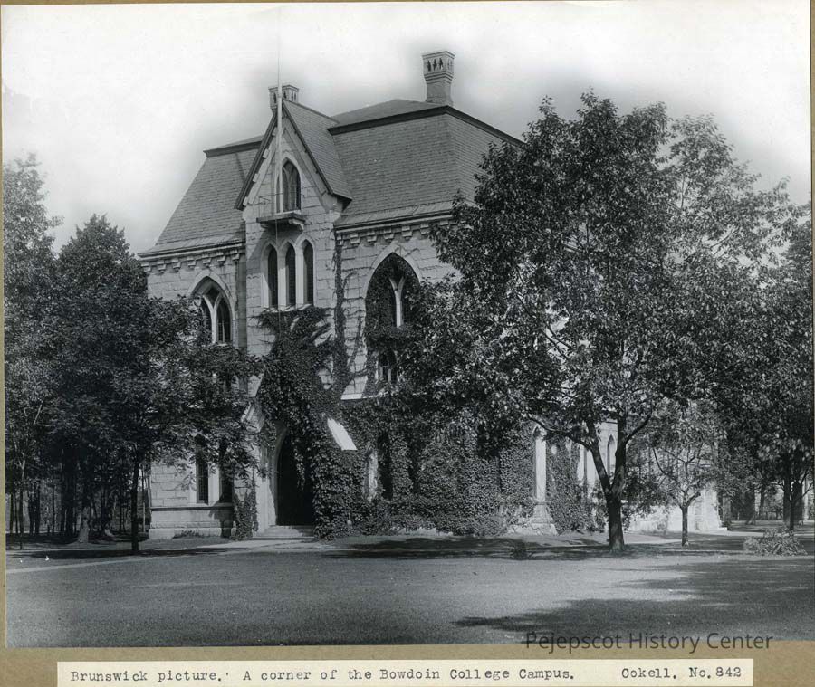 A black and white photograph of what is now Memorial Hall on Bowdoin College campus. The photograph is taken slightly from the right looking at the main entrance to the building. The caption on the photograph reads, "A corner of the Bowdoin College Campus." Undated