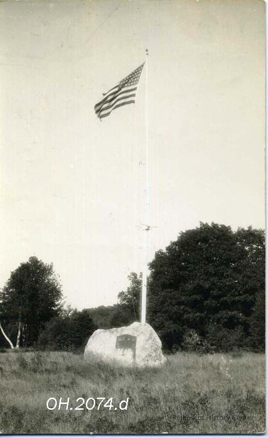 A B/W photograph of Memorial Rock and flag at Mere Point, Brunswick, ME. Not dated.